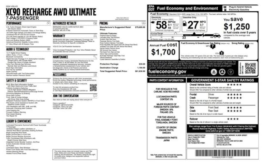 Bernardi Volvo Cars Natick is pleased to offer this 2024 Volvo XC90 T8 AWD Recharge Plug-In Hybrid ULTIMATE